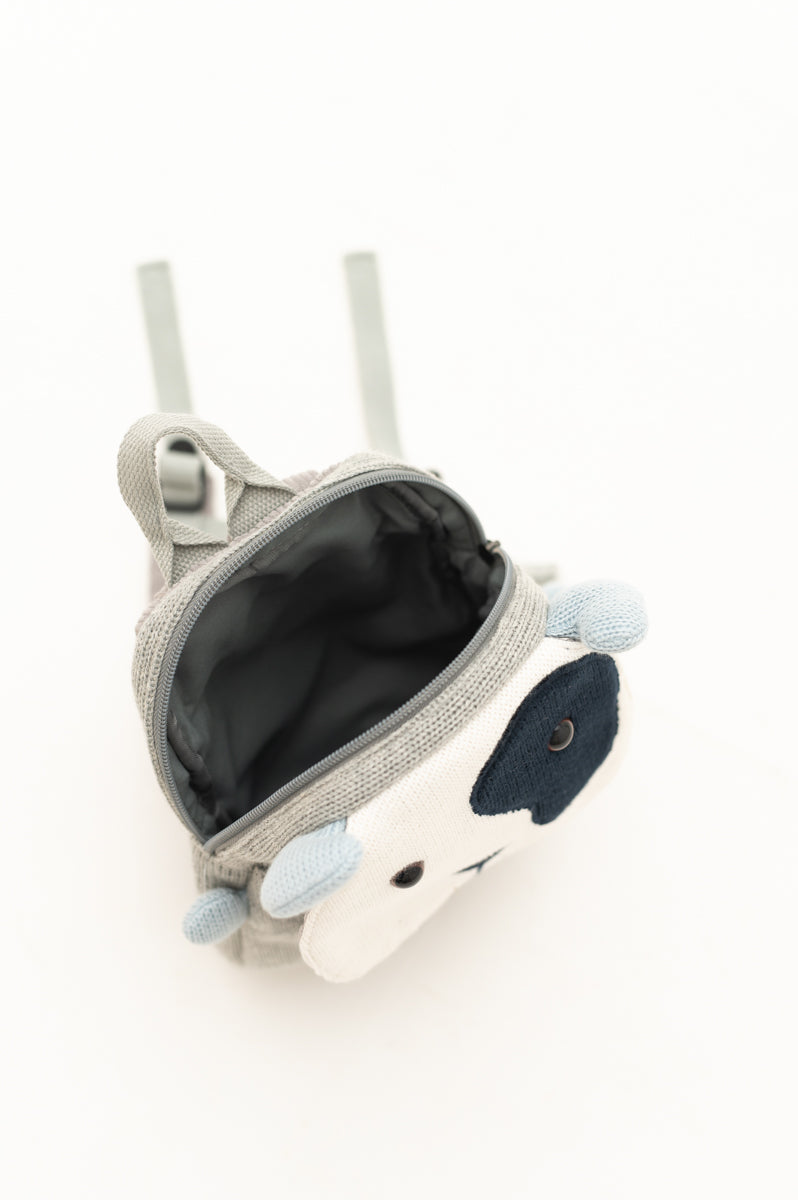 Nuestra mochila perro de crochet está hecha de algodón 100 % natural e hipoalergénico, increíblemente suave al tacto, y está disponible en gris y blanco . Tiene un divertido y adorable diseño de cachorro. Hemos pensado en cada detalle, como sus orejitas y sus lunares .