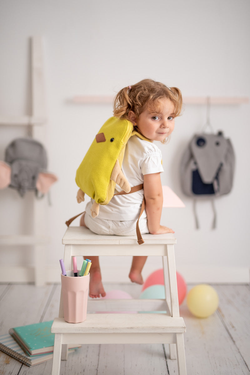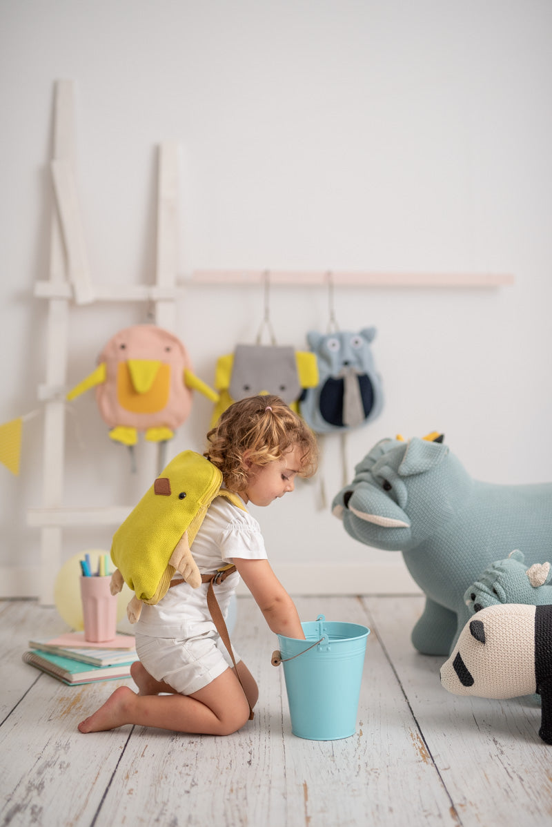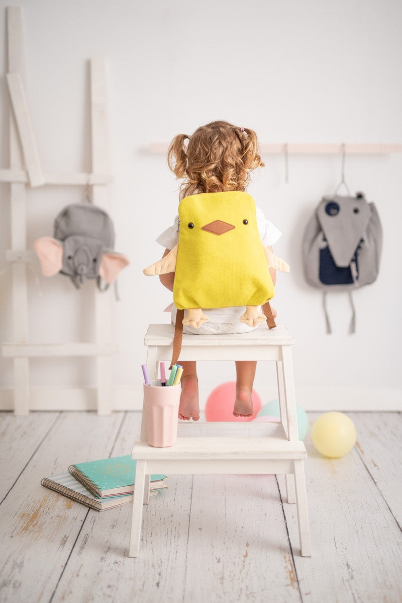 Todas nuestra mochilas están diseñadas pensando en los más pequeños. La mochila pollito dispone de un espacio de almacenaje con cierre en cremallera y asas ajustables.