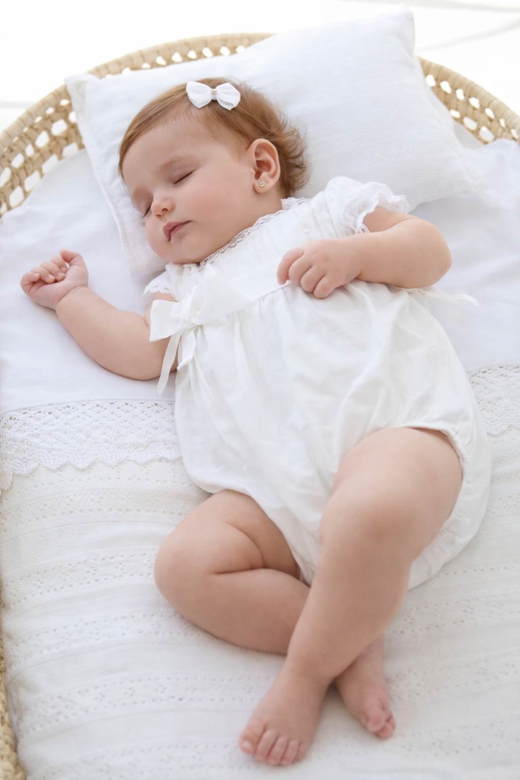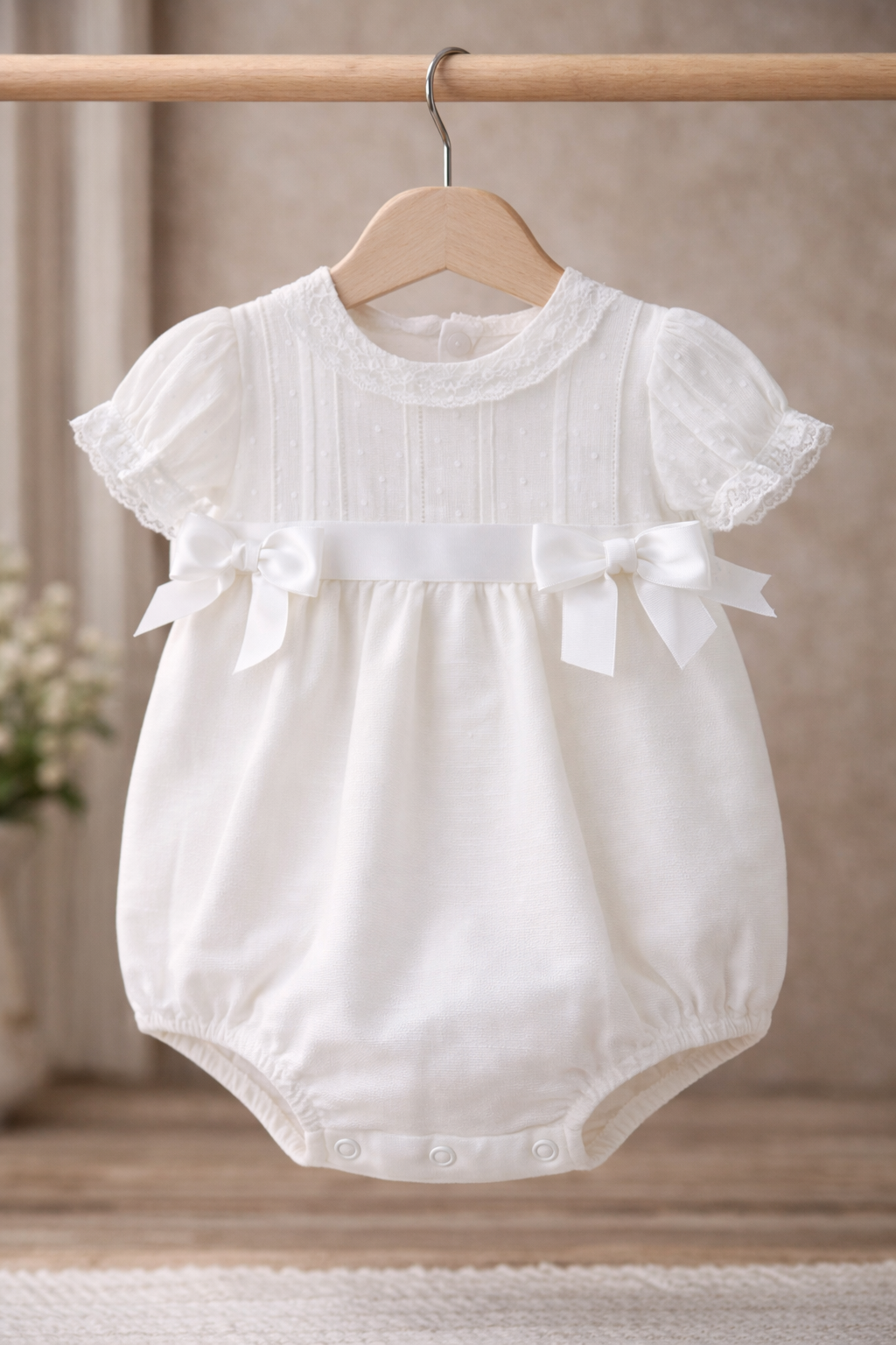Pelele de manga corta para recién nacido. Cuello redondo con volante. Botones a presión en la entrepierna para facilitar la puesta de la prenda. Cierre con botones en la espalda para facilitar la puesta de la prenda. Elementos de adorno: apliques de lazos.