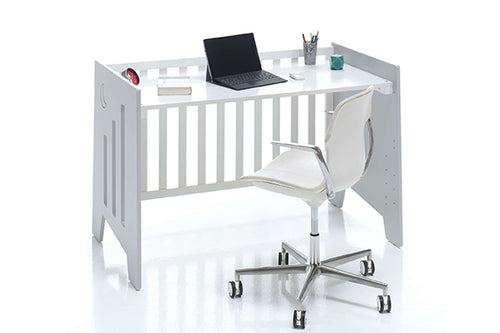 La cuna OMNI, desde el inicio, es una cuna y escritorio, por lo que en todo momento la puedes convertir en escritorio infantil sin necesidad de ningún kit adicional. Simplemente debes quitar la barandilla lateral, subir el tablero somier a la altura más elevada y quitar las ruedas. Y, así, ya dispones de un práctico escritorio infantil que tu hijo o hija podrá usar durante mucho tiempo. ¡Es super funcional!