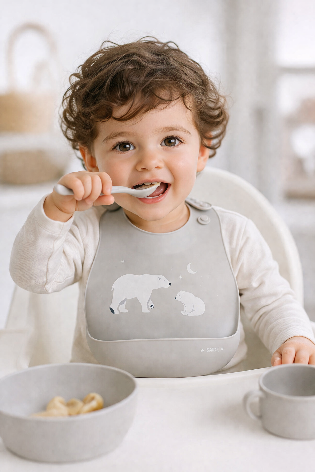 Este práctico babero con mangas de Saro será tu aliado perfecto para que tu bebé aprenda a comer y disfrute experimentando con la comida.