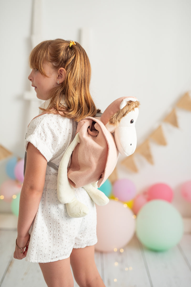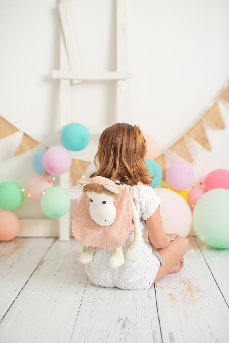 Nuestra mochila monito de crochet está confeccionada en algodón natural 100%, hipoalergénico, muy suave al tacto, en colores rosa y blanco. Un divertido y tierno diseño en forma de animalito. Hemos pensado hasta el último detalle, como su pelo y sus orejas. Un excelente compañero de viaje para los niños.