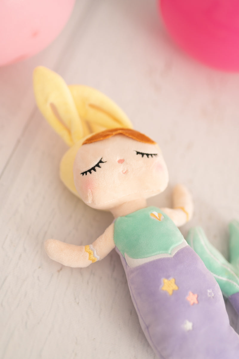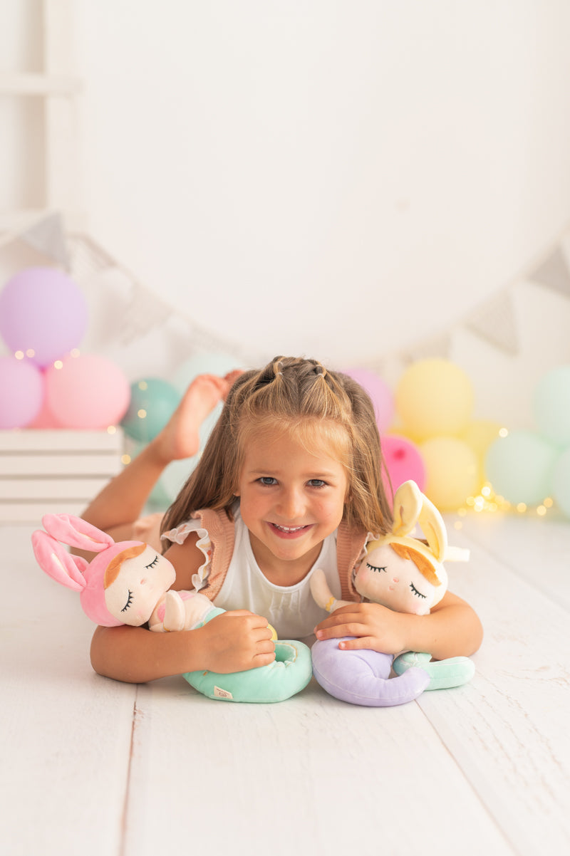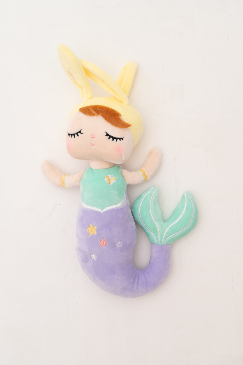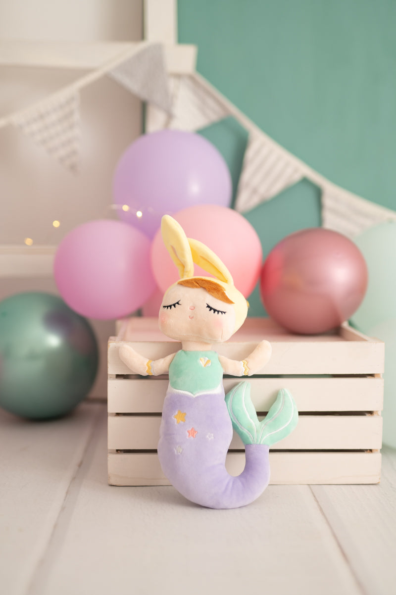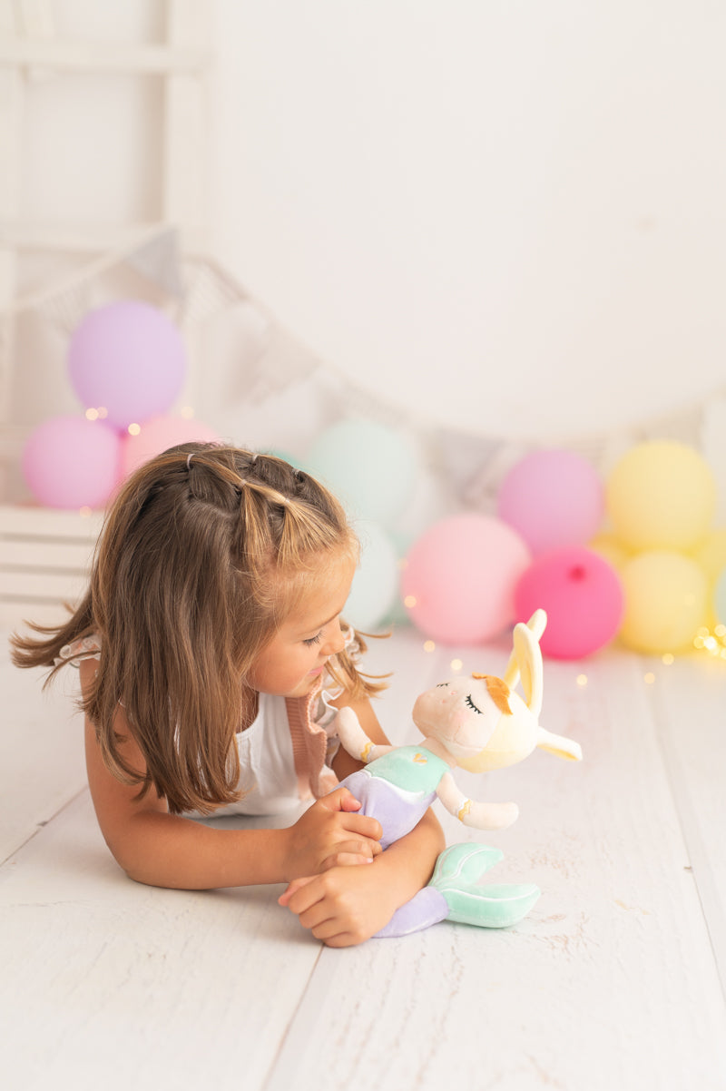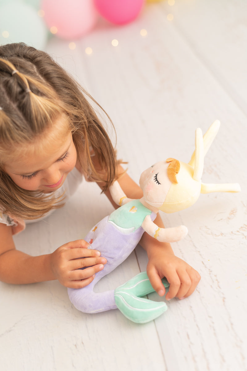 Nuestra muñeca sirena Luna está confeccionada en tejido extra suave y muy agradable al tacto. Su tierno diseño con cola color morada y orejitas lo convertirá en la muñeca inseparable de tu hija. Luna es más que un juguete: es una compañera de mágicas aventuras y un símbolo de amor y creatividad. Se vende en cajita regalo. Lleva asa colgante en la cabeza para poder colgarla del carrito o mochila.