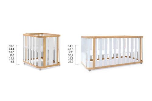 • El somier de la minicuna se puede ajustar a 6 alturas diferentes: 18,8 cm - 25,2 cm - 31,6 cm - 38 cm - 44,4 cm - 50,8 cm (con colchón); 10,8 cm - 24,2 cm - 30,6 cm - 37 cm - 43,4 cm - 49,8 cm (sin colchón).