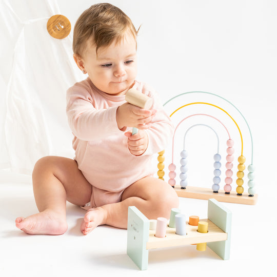 ¡Pum! ¡Pum! Este divertido banco, se convertirá en el juguete favorito de tu peque. Seis cilindros de colores listos para ser golpeados con un martillo de madera. Es un ejercicio perfecto para practicar y ejercitar su coordinación mano-ojo y sus habilidades motoras.